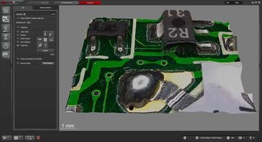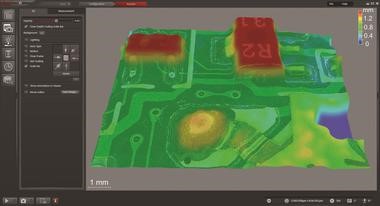顯示集成電路芯片和焊點(diǎn)的局部 PCB 三維圖像;利用 Leica DVM6 通過 LAS X EDOF(擴(kuò)展景深)功能捕捉。亦可參見右側(cè)帶彩色 Z 標(biāo)尺的相同圖像。
