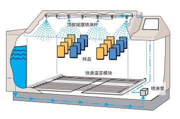 噴淋功能用于某些汽車腐蝕試驗(yàn)規(guī)范。用戶可調(diào)流量的溶液通過特別固定的噴嘴均勻地噴淋到試樣上