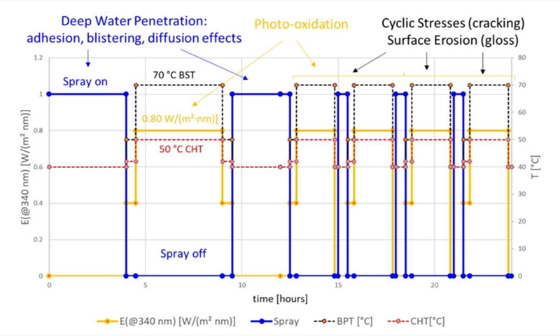 SAE J2527 每天有 16 個(gè)濕干循環(huán),ASTM D7869 每天有5個(gè)濕干循環(huán)(下圖)。如果一種材料對(duì)這種機(jī)械應(yīng)力敏感,那么 SAE J2527 可能是更好的選擇。