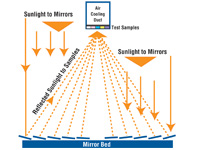 | 測(cè)試樣品放置在鏡面背面,以重新吸收反射的太陽(yáng)光。Q-TRAC 系統(tǒng)在測(cè)試耐久性材料方面表現(xiàn)尤為出色。 | 利用一系列 10 鏡面陣列反射全光譜太陽(yáng)光,并將其集中至測(cè)試樣品上。鏡面調(diào)節(jié)對(duì)系統(tǒng)性能至關(guān)重要。 |