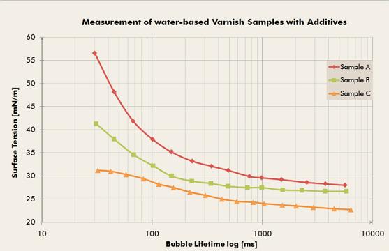 由于噴涂要求油漆的表面張力在短時(shí)間內(nèi)降低至所需程度,才能達(dá)到較好的潤濕性,所以恰當(dāng)?shù)谋砻鎻埩?dòng)態(tài)行為非常重要。而采用傳統(tǒng)的表面張力測試方法如環(huán)法、板法和毛細(xì)管上升法等,無法測量表面張力的動(dòng)態(tài)行為或者費(fèi)時(shí)失事。