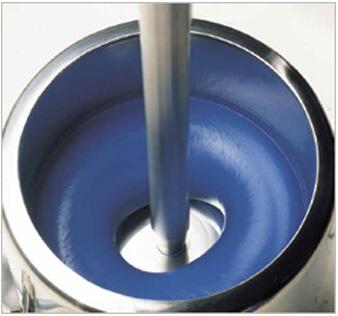 樹脂溶液中加入顏料和填料后,通過增加軸的轉(zhuǎn)速,物料進(jìn)入層流模式,直到容器壁上見不到粘附的材料。在合適的轉(zhuǎn)速下,軸的周圍會(huì)形成一個(gè)通道并逐漸能看見分散盤,這時(shí)物料就形成了甜甜圈形狀的流型。甜甜圈流型的形成是表示輸入到物料中的機(jī)械功率已達(dá)最大,此外,由于物料被攪動(dòng),故所有的團(tuán)聚體都能抵達(dá)分散盤外沿。
