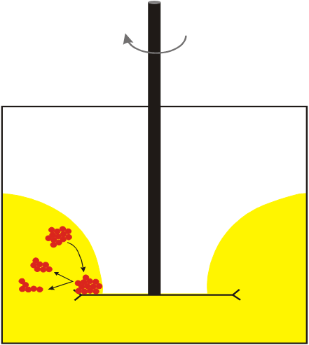 樹(shù)脂溶液中加入顏料和填料后,通過(guò)增加軸的轉(zhuǎn)速,物料進(jìn)入層流模式,直到容器壁上見(jiàn)不到粘附的材料。在合適的轉(zhuǎn)速下,軸的周圍會(huì)形成一個(gè)通道并逐漸能看見(jiàn)分散盤,這時(shí)物料就形成了甜甜圈形狀的流型。甜甜圈流型的形成是表示輸入到物料中的機(jī)械功率已達(dá)最大,此外,由于物料被攪動(dòng),故所有的團(tuán)聚體都能抵達(dá)分散盤外沿。