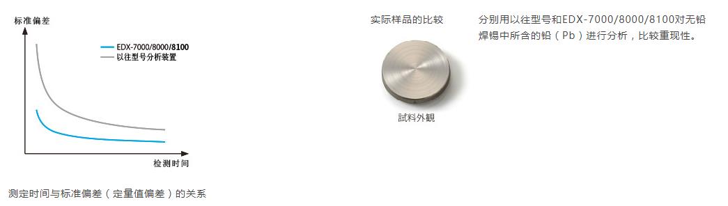 X射線熒光分析可以通過延長測定時間增加X射線熒光的計數(shù)從而提高精度(重現(xiàn)性)。搭載高計數(shù)率SDD檢測器的EDX-7000/8000/8100與以往型號相比,能夠在更短的時間內(nèi)保證分析精度。