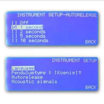 ![]() | 步進電動機全自動定位擺桿。通過電磁系統(tǒng)自動釋放擺桿,排除人工誤操作。 | ![]() | 菜單導(dǎo)航輕松校準(zhǔn)Konig擺桿(科尼克)和Persoz擺桿(培爾左茨) |