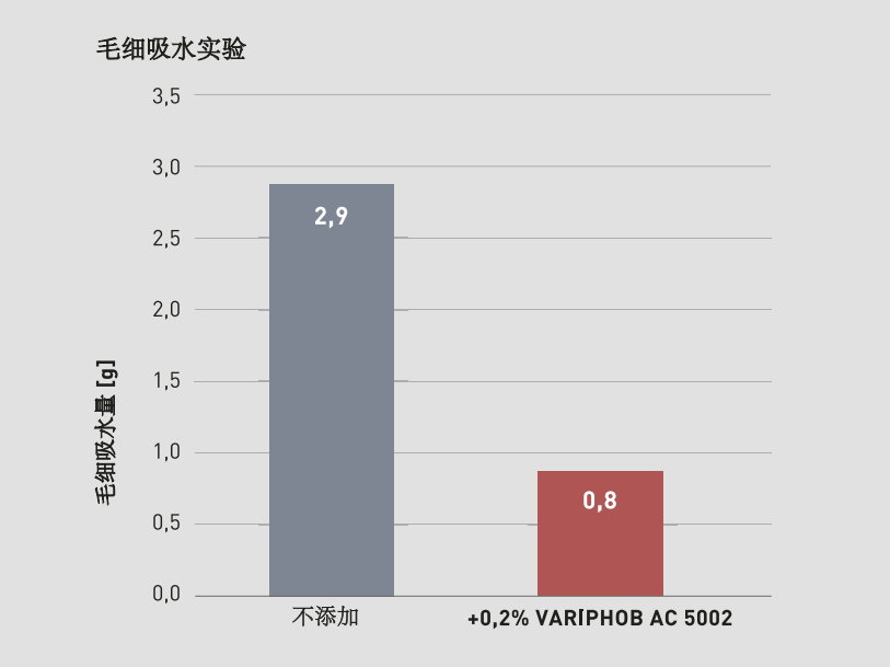 AC 5002 作為粉末狀憎水憎水劑,可在基材固化后表面形成憎水保護(hù),能用于水泥基礦物為原料的干混砂漿體系,阻止材料中毛細(xì)管對水的吸收,大大降低基材的吸水率,提高優(yōu)異的憎水性能;可應(yīng)用在防水砂漿,膩子,填縫劑,裝飾砂漿等場景;