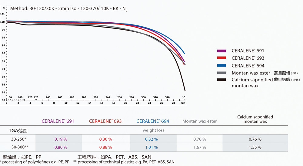 ※不同的工程用樹脂如PC,PS,PA,ABS,POM,PET,PE和PP,提供優(yōu)異的溫度穩(wěn)定性﹑極低的揮發(fā)性以及改善表面光澤,不會(huì)導(dǎo)致析出