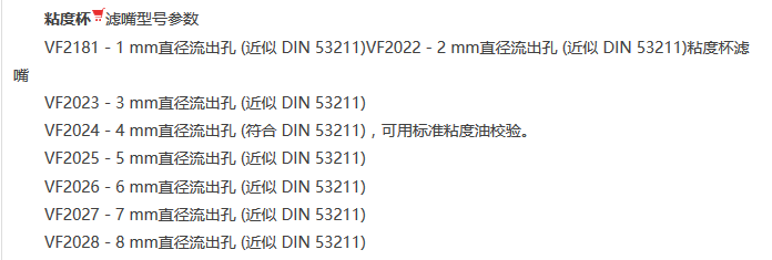 荷蘭 TQC VF2181 濾嘴是荷蘭進(jìn)口的,型號(hào)是VF2181,符合DIN53211,直徑是1mm。那么,粘度杯濾嘴不同型號(hào)參數(shù)如下: