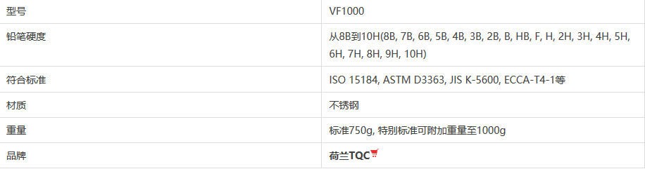 荷蘭 TQC VF1000硬度測試鉛筆,鉛筆硬度范圍8B到10H,功能是測量涂料表面硬度之刮抗性,可用于實(shí)驗(yàn)分析或控制產(chǎn)品品質(zhì),包括油漆涂料、家具、汽車、PC板之涂漆,單層或多層烤漆等行業(yè)。